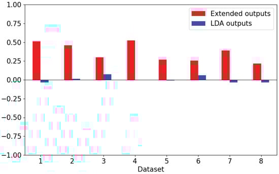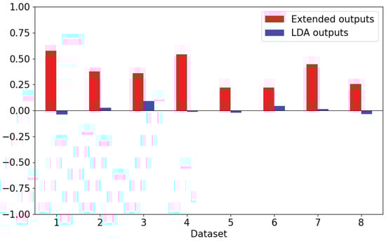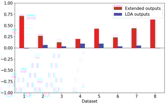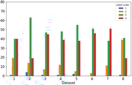 Figure 10, Figure 11 and Figure 12 report the inter-annotator agreement for the quality and usefulness of both the topic modelling outputs across each dataset as well as the efficiency of the annotation task. For quality, the extended outputs reported the highest agreement of = 0.522 (dataset ID = 4) and the lowest agreement of = 0.216 (dataset ID = 8). Likewise, for usefulness, the extended outputs reported the highest agreement of = 0.575 (dataset ID = 1) and the lowest agreement of = 0.220 (dataset ID = 5 and 6). In terms of the LDA outputs, for quality, the highest agreement reported was = 0.075 (dataset ID = 3) and the lowest agreement was = −0.036 (dataset ID = 7). Likewise, for usefulness, the LDA outputs reported the highest agreement of = 0.090 (dataset ID = 3) and the lowest agreement of = −0.040 (dataset ID = 1).