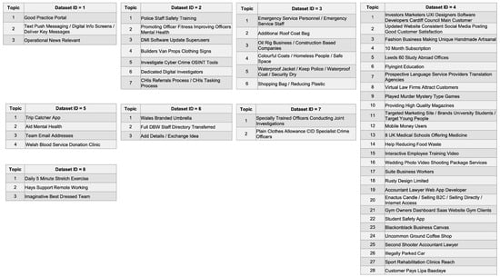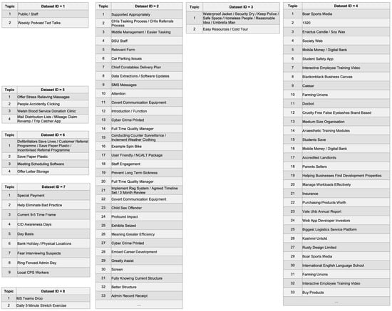 Figure 2 reports the extended outputs across each of the ten topic extracted for all datasets. In very few examples (e.g., Free Blood Pressure Testing Carries (dataset ID = 6) and Dedicated File Preparation Officers Located (dataset ID = 7)), extended outputs may lack minor subject–verb agreement and coherence. However, in comparison to the token list output produced by the LDA topic modelling approach (Table 3), the resulting extended method presents more cohesive and contextualised topic descriptions.