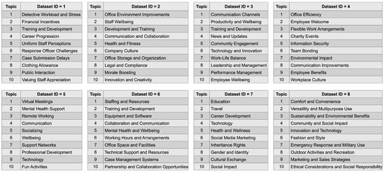 Figure 15 and Figure 16 report the topics generated across each of the ten topics extracted for all datasets by Llama and ChatGPT, respectively. When comparing such results with those generated by the proposed method in Figure 2, each topic modelling method has consistently generated themes with a focus on workplace-related terms such as well-being, training and development, and engagement (dataset IDs = 1, 2, 5, and 6). Customer engagement and business operations (dataset IDs = 2, 7), as well as community engagement and corporate social responsibility (dataset IDs = 2, 4, 6, 7, 8), are prevalent topics in all outputs. Both ChatGPT and Llama occasionally generate specialised topics, such as Cybercrime and Digital Forensics (dataset ID = 6) and Ethical Considerations and Social Responsibility (dataset ID 10), as well as offering a broader perspective that applies to wider contexts, with topics such as Role Awareness and Understanding (dataset ID = 1) and Team Building and Engagement (dataset ID = 5).