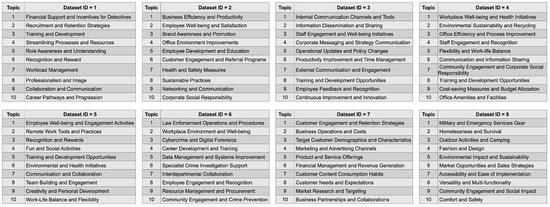 As similarly discussed in Section 7, when observing the topics generated by each method, a high degree of correspondence across each dataset may be found, indicating a strong thematic alignment. The proposed method not only matched but occasionally enhanced the topic coverage offered by the aforementioned state-of-the-art language models. For example, in dataset ID = 2, whereas ChatGPT and Llama generated the topic descriptors Employee Well-being and Satisfaction and Staff Wellbeing, the proposed method generated Dedicated Mental Wellbeing Support Group. Another example is dataset ID = 1, where ChatGPT and Llama generated the topic descriptor Training and Development, and the proposed method generated Force Training Days Comms Opportunity. This shows that not only does the proposed method resonate with the thematic coverage found in ChatGPT and Llama, but it often surpasses such models by bridging the gap between broad thematic elements and granular details.