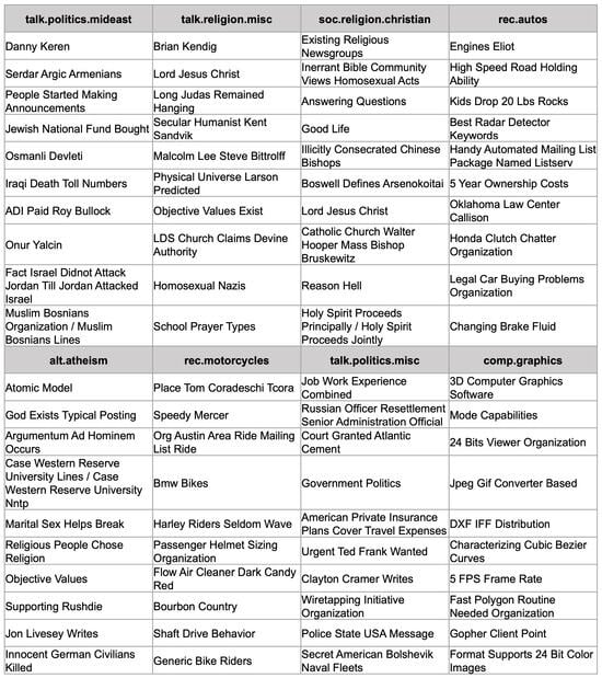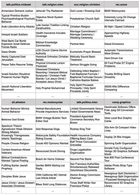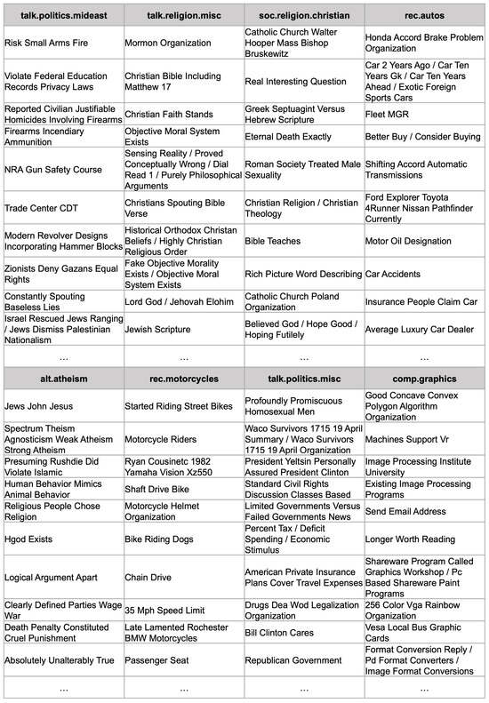 The 20 Newsgroups dataset [] is commonly used for text mining applications. It is a collection of approximately 20,000 news group documents, distributed (nearly) evenly across 20 different news groups. The documents within the 20 Newsgroups dataset exhibit a range of lengths and cover a spectrum of topics, from religion to politics to automotive and technological discussions, providing a comprehensive basis for testing the robustness of the proposed approach in a more heterogeneous textual environment, enhancing the external validity of this research. Table 5 shows how the 20 news groups are partitioned according to subject matter.