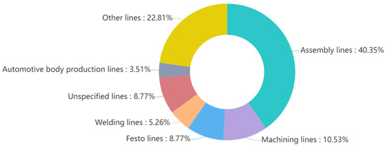 We searched for the relevant journal and conference articles that were published from 2017 to 2023 containing “digital twin” in the title and “production line”, or “manufacturing line”, or “assembly line”, in the title or abstract, and we removed the articles about process manufacturing. In total, 57 articles were included in this research. The statistics regarding the number of various types of manufacturing lines are shown in Figure 1. There were twenty-three articles for assembly lines, six articles for machining lines, five articles for FESTO experimental lines, and five articles for unspecified lines, with toys, packaging, and brake discs being categorized as the other lines.