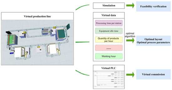 For the planning and design stages of a production line, it is necessary to carry out layout planning, process planning, the design of the process, and the design of the control strategy for the production line. The physical production line may not exist at this stage. A production line model can be built quickly by commercialized general-purpose software. Then the optimization algorithm can be used to analyze the simulation data to obtain the optimal layout, processing parameters, etc., as shown in Figure 3. To facilitate the timely detection and resolution of problems, simulation of the production line at an early stage can verify the feasibility of the design as well as the process and manufacturing, and the simulation can also be used to improve the existing production line’s layout and imbalances in production and other issues to improve the efficiency of production and utilization of equipment [19,20,23,24]. For example, Tu [23] built a simulation model of a wheelset pressing line with Flexsim to determine the “bottleneck” problem in the line and put forward optimization methods. Unlike the offline simulation above, Guo [24] used Plant Simulation to adopt a decoupling method based on the event mechanism and multi-objective optimization, which was continuously optimized in the simulation and verified in an air-conditioning production line.