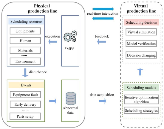 The scheduling of production lines can be categorized into static and dynamic scheduling. Earlier researchers studied the optimization of an objective under certain conditions, such as minimizing the total completion time, assuming that the processing time is fixed [73]. In actual production, however, various situations cannot be carried out according to the original production plan; for example, through equipment failure, absent workers, scrap parts, raw material shortages, early delivery, or insertion orders [74]. Therefore, a timely response to dynamic events in scheduling the production job shop becomes an important problem that needs to be solved urgently [75]. Digital twins, which have the characteristics of virtual reality mapping and interactive fusion, provide a new way of solving scheduling problems in smart manufacturing, and they can generate new scheduling plans by building production scheduling models and scheduling algorithms, as shown in Figure 4. To resolve the dynamic disturbances in the assembly process, Shen [30] established a DT-based bearing assembly planning model and proposed a task rescheduling strategy for a robotic assembly line. Villalonga [29] presented a framework for decentralized and integrated decision-making for re-scheduling of a cyber-physical production system, and the validation and proof-of-concept of the proposed method was conducted in an Industry 4.0 pilot line of an assembly process. The experimental results demonstrated that the proposed framework was capable of detecting changes in the manufacturing process and making appropriate decisions for re-scheduling the process. Table 3 shows the scheduling case studies.