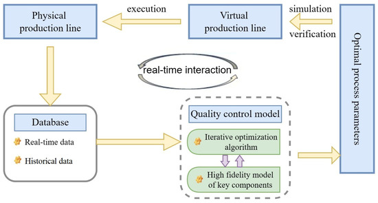 Timely adjustments can be made to improve the products’ quality by storing, analyzing, and calculating the large amount of production data collected. First, a high-fidelity model of the key components of the production line needs to be established, such as the establishment of a high-fidelity model of the cutting tools, to ensure the accuracy of the machined parts. Then the data are analyzed, and the features are extracted to establish a process database that affects the products’ quality. The optimal processing parameters can be obtained by iterative optimization algorithms. Finally, the optimal processing parameters are implemented in the physical production line to control the products’ quality, after simulation and verification by the twin model, as shown in Figure 5. Zhang [33] designed a new intelligent production line for automotive MEMS pressure sensors driven by a DT, and the real-time online monitoring and regulation of the products’ quality was realized by establishing a database of the key processes. Liu [38] proposed a cloud-edge-based DT system (CEDTS) with a four-terminal-architecture. With the implementation of the CEDTS, the range of fluctuation of geometric errors of the machined parts was reduced significantly. To solve the optimization problem by considering data on the overall quality of assembly, Ma [41] introduced a data-driven quality control model.