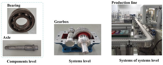 Predictive maintenance (PdM) is the most widely used maintenance strategy [77]. A digital twin for PdM enables accurate recognition of the equipment’s status and proactive fault prediction. This shift from reactive to proactive services optimizes maintenance schedules, minimizes downtime, and improves an enterprise’s profitability and competitiveness [78]. Dinter categorized the DT abstraction layer for predictive maintenance into three levels: components, systems, and systems of systems. Here, a component could be a bearing or a pump, and a system can be a gearbox or engine, while a system of systems may represent a shop floor or a fleet of airplanes [79], as shown in Figure 6 below.
