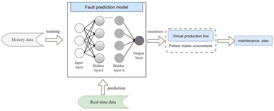 The application of a hybrid model-driven and data-driven DT for fault prediction is shown in Figure 7. After the fault prediction model is trained with historical data, the real-time data of physical equipment are inputted to predict the state of the equipment. If the predicted data are abnormal, the corresponding maintenance plan will be inputted into the virtual model for simulation, verification, and evaluation. Finally, a maintenance plan is generated to realize PdM.
