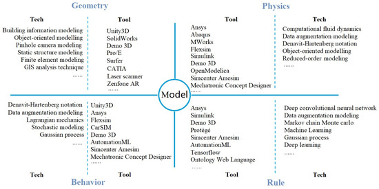 The model is an important component of the DT and is an important premise for the realization of the DT’s functionality [87]. The key technical difficulty in the application of DT technology in the manufacturing field is establishing a multi-dimensional fusion model that realistically simulates and reflects physical entities [76]. For example, the Beijing-based power company BKC Technology struggled to work out that an oil leak was causing a steam turbine to overheat. It turned out that lubricant levels were missing from its DT [88]. Through high-fidelity digital models, management of the whole life cycle from design and simulation to manufacturing and maintenance was realized. Tao [89] proposed the construction of a model including four dimensions: geometry, physics, behavior, and rules; and the techniques and tools used for modeling were summarized as shown in Figure 8 below.