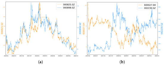 Correlations in stock prices (both positive and negative correlations). (a) Trend chart of 000825.SZ and 000898.SZ (unit: CNY). (b) Trend chart of 600027.SH and 002230.SZ (unit: CNY).