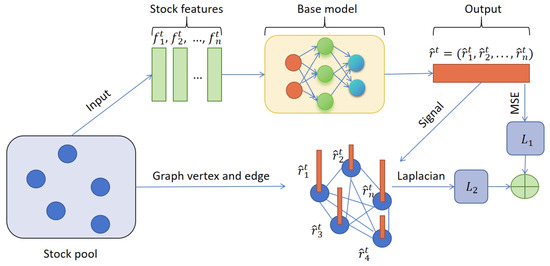 Here, is the entry of the adjusted weight matrix. It represents the correlation between stock i and stock j; therefore, we employ it as a weight coefficient. Although some studies indicate that correlations may not be fully maintained in the long run, researchers found that short-term correlations of assets exhibit relatively little change. Let be an autoregression model to formulate the dynamic evolution of correlations. Empirical results [36,37] show that the is always within , thus showing that the correlation of adjacent time periods is very close. Therefore. it is expected that stocks with positive correlations in the past will maintain the correlation in the near future. The greater the correlation coefficient between two stocks, the more similar their future trends will be. This term can be computed in a vectorized manner by the Laplacian matrix of the graph, and the matrix form can improve computational efficiency. Let be the prediction vector on day t. The second loss term can be then formulated as