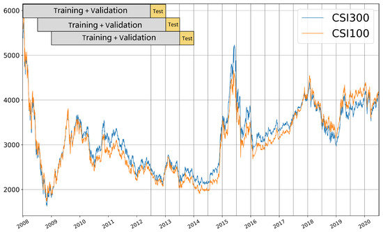 Figure 3 shows the temporal evolution of the CSI 100 and CSI 300 indices over the period from 1 January 2008 to 30 June 2020, as well as our division of training and testing sets. This time frame encompasses various market styles, including sharp rises, sharp falls, and minor fluctuations. This diversity in market styles can check our model’s performance under different market conditions, ensuring that our model has good generality and robustness.