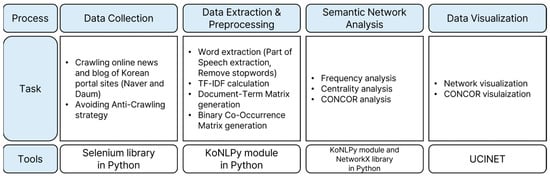 Among various Big Data analytics techniques, semantic network analysis is a method that models semantic relationships represented by graphs with nodes and edges [30]. Semantic networks can be automatically extracted from unstructured text data and used as a medium for visual text analysis, incorporating information retrieval and text mining techniques to extract relationships within the text [31,32,33].