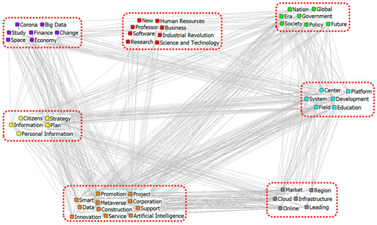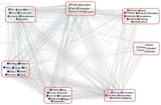 A CONCOR analysis was conducted based on structural equivalence by analyzing the Pearson correlation from the keyword COM, resulting in clusters. Figure 2 presents the outcome of the CONCOR analysis performed on the digital transformation network generated from online news, identifying a total of seven clusters. The clusters are represented as [Word1, Word2, …]. The cluster [Operation, Data, Bio, Development, Contents, Plan, Smart, Construction] can be interpreted as embodying the theme of technological advancement and strategic growth. The cluster [Support, Government, Corporation, Field, Project, Promotion] suggests that the government and various corporations collaborate to support innovative projects aimed at advancing key industrial sectors. The cluster [Training, Infrastructure, Cloud, Leading, Competence, Institution, Personal Information, Finance, Professor] represents the context of education, technology, and expertise development within an institutional framework. The [Software, Tech, Study, School, Student] cluster indicates an education or learning environment focused on technology and software. The cluster [Information, Innovation, Artificial Intelligence, Education, Future] encompasses future-oriented and technology-driven themes. The [Citizens, New, Human Resources, Investment, Region, Cooperation, Service, Metaverse] cluster can be seen as focusing on community and technological development within geographic or digital spaces. Lastly, the [Strategy, Platform, Society, Policy, Center, Global, Economy, Nation, Era] cluster can be interpreted as countries developing policies centered around digital platforms to drive economic growth or societal development in the global era.