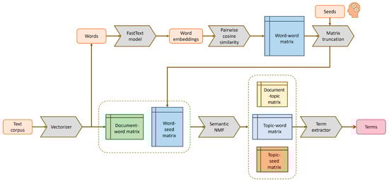 - The creation of the word–seed matrix. This matrix is formed by calculating pairwise cosine similarities between the embeddings of words and predefined seed words. Seed words are selected by a domain expert based on their relevance to the domain, helping to anchor the semantic space around key concepts.