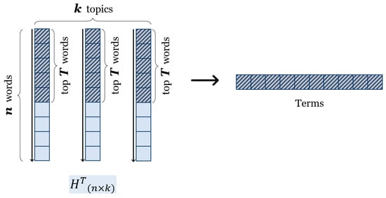 The approach to term extraction using NMF is straightforward: extract the top words with the highest coefficients from each of the topics in the transposed matrix , resulting in kT candidate terms, as shown in Figure 3. However, since a word can appear at the top of several topics (having high coefficients in multiple topics), the final number of unique candidates may be significantly less than kT after duplicates are removed. As noted in [], a close examination of the encoding vectors produced by NMF reveals a high degree of overlapping, indicating that some words can be representative of multiple topics.