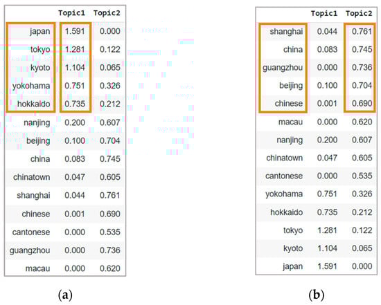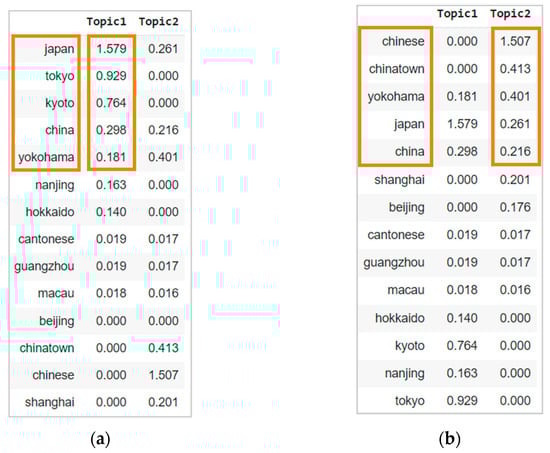 The semantically enriched topic–word matrix, after transposition, is organized as follows: (a) sorted in descending order by coefficients in the Topic 1 column; (b) sorted in descending order by coefficients in the Topic 2 column.