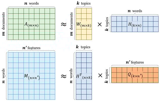 A joint decomposition of the document–word matrix and the word–feature matrix into two separate products and is required, sharing a common factor (see Figure 6). Thanks to the joint factorization, it is expected that topic–word matrix will place semantically related words closer to each other in the compressed space of topics of dimension k []. Thus, semantic NMF employs a complex cost function L, which, as in standard NMF, can be defined using the Frobenius norm: