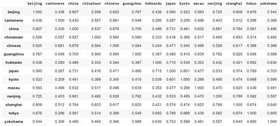 The word–word matrix M, representing similarities between words in FastText embeddings space.
