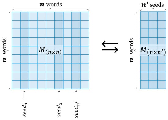 The symmetric word–word matrix of dimension , which integrates relationships among words into the semantic NMF algorithm, is a particular case within a broader class of matrices, , of dimension , offering word representations in various semantic feature spaces. For instance, the word–word matrix of dimension can be easily replaced by the word embedding matrix of dimension , where 300 is the common length of embedding vectors in the well-known word2vec model []. In this study, we expand on the idea of mapping words into a compressed space of semantic features, which we refer to as domain seeds. Therefore, we replace the original word–word matrix, which represents pairwise cosine similarities between word embeddings, with a reduced submatrix that keeps all rows but only includes the columns corresponding to seed words (see Figure 9).