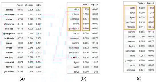 Below, we continue our example from Section 3.1 and Section 3.2, using three specific seed words, namely, ’Japan’, ’Chinese’, and ’China’, to reduce our word–word matrix (see Figure 10a). We apply semantic NMF using reduced matrix . Despite the reduction, the semantic NMF algorithm still effectively distinguishes between topics, as evidenced by the clear topic separation shown in Figure 10b,c.