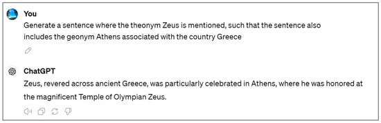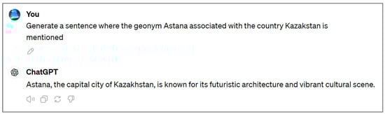 At the second step, experts generate sentences containing selected terms with the help of Chat-GPT-4. For example, for the GH dataset, their requests can be structured as follows: ‘Generate a sentence where the geonym XXX associated with the country YYY is mentioned’. This is as illustrated in Figure 11. For the NH dataset, the requests can be structured as follows: ‘Generate a sentence where the anthroponym/theonym XXX is mentioned, such that the sentence also includes the geonym YYY associated with the country ZZZ’, as shown in Figure 12. At the third step, the outputs of ChatGPT-4 are manually checked for reliability and consistency, with any sentences that exhibit anomalies or hallucinations being corrected or refined. Table 3 provides random examples of sentences from both datasets for each of the 10 countries.