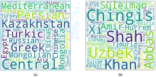 If we sum up the number of unique terms in Table 4, we obtain 653 terms for the GH dataset and 476 terms for the NH dataset. For the NH dataset, this number matches the real number of unique terms, since classes do not share common terms. For the GH dataset, classes share common terms; for example, the term ‘Altai’ occurs in sentences of the Russian, Mongolian, and Kazakhstani classes. So, 653 is the number of terms with duplicates, whereas the number of unique terms in the GH dataset is 461. Regarding words, the most frequently used word in the GH dataset is ‘city,’ which appears 136 times, while the most frequently used word in the NH dataset is ‘born,’ which appears 159 times. Table 5 displays the top 10 words for both datasets. Regarding terms, the most frequent geonyms in the GH dataset are ‘Central’ and ‘Kazakhstan,’ while the most frequent anthroponyms in the NH dataset are ‘Chingis’ and ‘Khan.’ Figure 13 illustrates term clouds for both datasets.