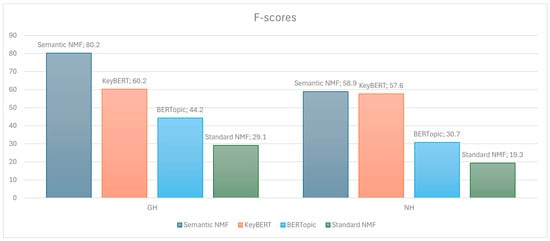 We compared our approach with traditional NMF [] and the recent, but already popular, transformer-based methods KeyBERT and BERTopic [,]. The results demonstrated the significant superiority of semantic NMF across two related datasets from the Geography & History and National Heroes domains, which were generated using GPT-4 and subsequently manually checked and annotated. Therefore, the main contributions of our study are as follows.
