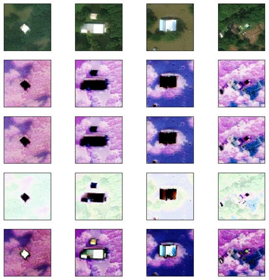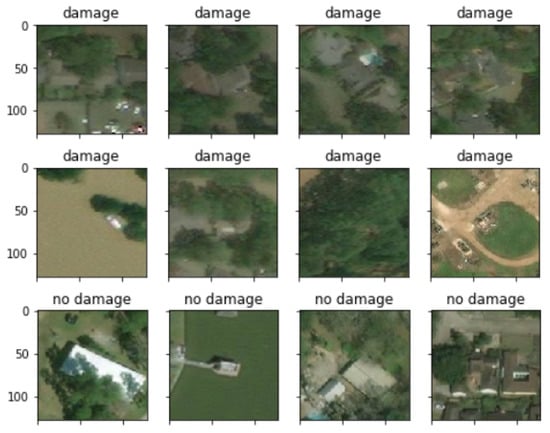 HD dataset contains 23,000 256 × 256 RGB pictures of damaged and undamaged buildings. This dataset is composed of images taken from a satellite in the Greater Houston area after Hurricane Harvey that affected the area in 2017. In this research, we tried to eliminate potential bias of HD dataset; thus, we used a subset of the HD dataset that contains an equal number of images of every class—5000 images of damaged and 5000 of undamaged buildings. Figure 2 shows a sample of the dataset with examples of both damaged and undamaged buildings.