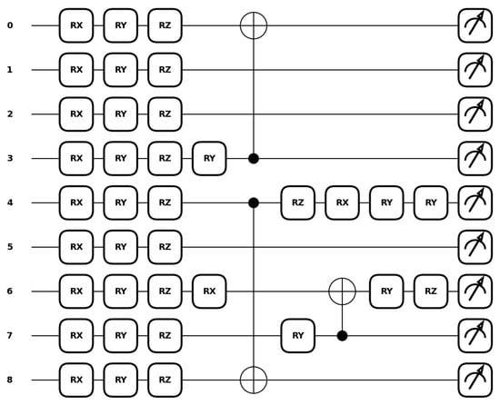 Both CIFAR100 and HD datasets were pre-processed using several different quantum devices that performed different operations on input images from datasets. This pre-processing is effectively the first quantum convolutional or quanvolutional layer of an HNN. This process has three hyper-parameters: size of convolutional kernel, stride of convolution kernel, and type of operations that are run in a quantum device. In this research, we used 2 × 2 and 3 × 3 convolutional kernels, 1 and 2 as stride values and X, XY, and XYZ qubit rotations as operations in a random quantum circuit. Figure 3 shows a diagram of an example random quantum circuit with 9 qubits.