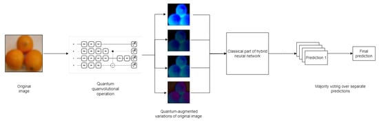 Figure 4 shows a high-level architecture diagram of HNNs that were used in this research. This diagram shows general concepts and illustrates flow of data through the network. The first operation that is performed against an original image is the quanvolution operation performed by a quantum circuit. The detailed algorithm is described in Section 3.5, Data Pre-Processing Process. Quanvolutional layer produces multiple quantum-augmented versions of the original image, the number of output images is equal to the number of qubits in a quantum circuit that was used for quanvolution. Then, every quantum-augmented image is processed by a classical part of the network, which is a non-modified classical model. The last step of the process is an application of the Majority Voting algorithm for deriving a single final prediction based on classical model predictions for all quantum-augmented versions of the original image.