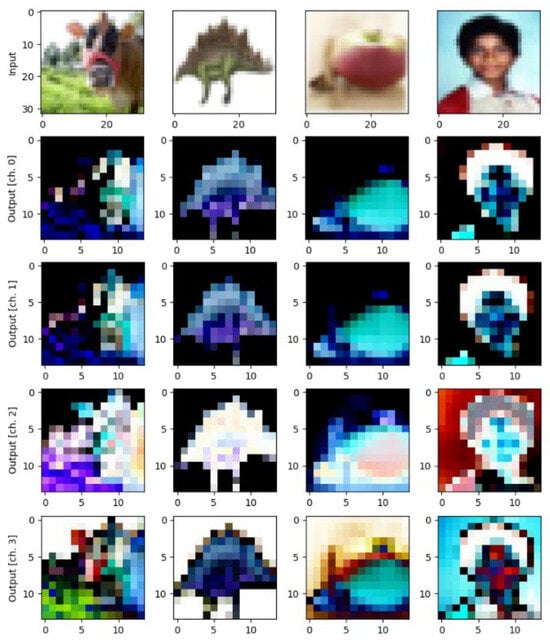 All output datasets are available on Kaggle [,]. Each pre-processed dataset contains twelve versions of images, one for every combination of our hyper-parameters: 2 × 2 and 3 × 3 quanvolutional kernel sizes, one and two strides, and X, XY, and XYZ qubit rotations. Figure 5 shows samples of the CIFAR100 dataset after processing. Figure 6 shows samples of the HD dataset after processing. In order to be brief, we will not include samples of all 12 versions of both datasets and we hope that the attached samples illustrate a general idea of the results.