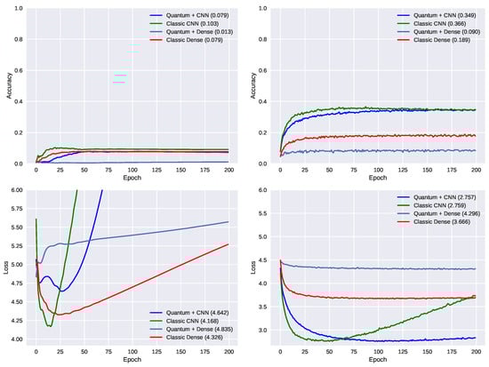 The histories of validation accuracy (max values in parentheses) and loss (min values in parentheses) values for the quantum pre-processed CIFAR100 datasets are shown in Figure 7 for 1000 original training images (Figure 7, left) and 50,000 original images (with the addition of 200,000 pre-processed training images, see the details below) (Figure 7, right). Here, 2 × 2 kernel size, one stride, and X qubit rotation were used.