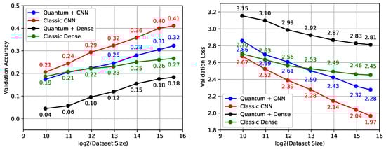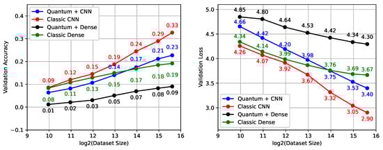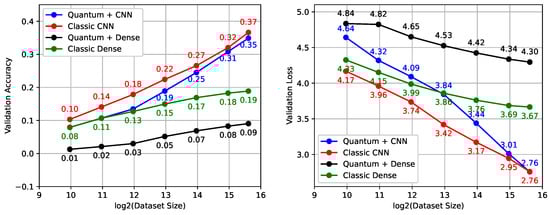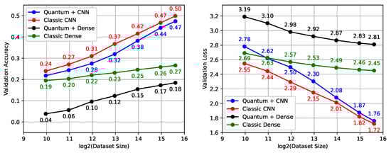 It should also be noted that, for the HNN model “Quantum + CNN” with 256 filters in a CNN layer (Figure 9), an increase of the dataset leads to a radically different rate of improvement for accuracy and loss. For dataset sizes in the range of 1000–4000 original training images, the accuracy (the first three data points in Figure 9, left) line follows the low improvement rate similar to the accuracy improvement rate of the simpler “Classic Dense” model. However, for dataset sizes in the range of 4000–50,000 original training images, the accuracy (the next five data points in Figure 9, left) line follows the high improvement rate, which is even faster than the accuracy improvement rate of the “Classic CNN” model.