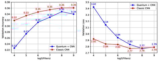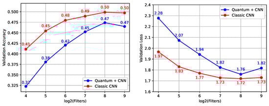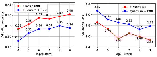 Again, it should be noted that an increase of the number of convolutional filters in a CNN layer leads to the much faster improvement of the “Quantum + CNN” model in comparison to the “Classic CNN” model.