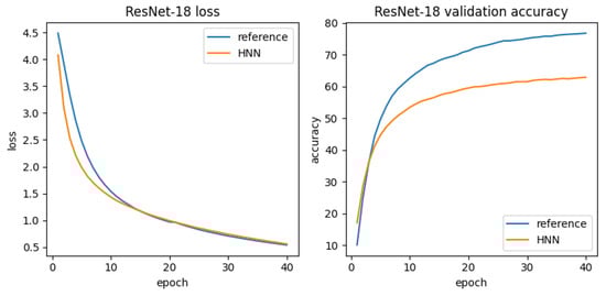 Loss and accuracy of ResNet-18 HNN and reference on CIFAR100.