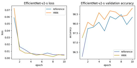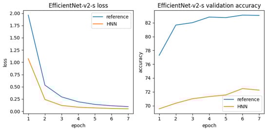 Loss and accuracy of EfficientNet-v2-s HNN and reference on Hurricane Damage dataset.