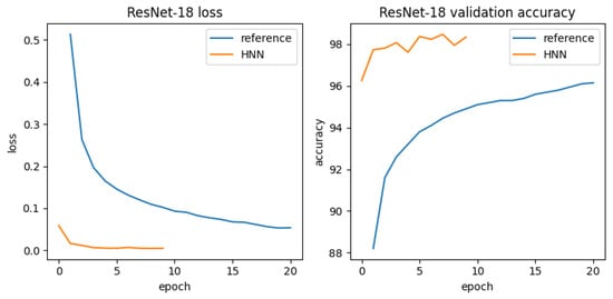 Loss and accuracy of ResNet-18 HNN and reference on Hurricane Damage dataset.