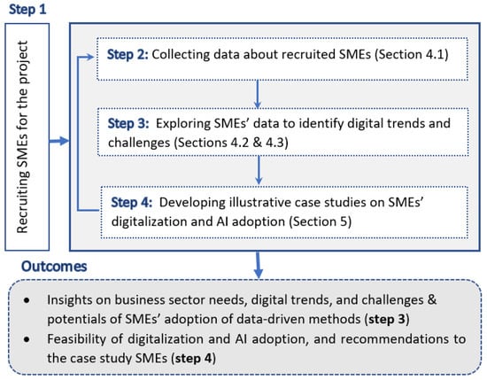 The overall research framework employed in this study is illustrated in Figure 1. In the first step, SMEs were recruited for the BDC project (cf. demonstration in Figure 2). Stages 2 and 3 of the research methodology are concerned with SMEs’ data collection and analysis in order to identify their digital technology trends and challenges to embarking on the route to digitalisation and use of data-driven methods. In stage 4, specific case studies were developed to respectively demonstrate digital transformation and AI use by SMEs.