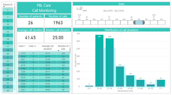 Guidance from the National Institute for Health and Care Excellence (NICE) states that home-care visits to elderly people should last for at least half an hour unless specific circumstances are met [33]. Based on this, we built an interactive dashboard using Microsoft Power BI (Version: 2.6) to monitor the duration of visits as presented in Figure 9. The dashboard enables users to select a month, a service user (patient), a care staff member or a histogram range by clicking on an ID or time range. The information displayed on the dashboard is filtered interactively based on the user selection. The dashboard allows the PBL Care management team to look for specific service users or care staff, and to check whether NICE guidance on visit duration is followed. Users can get the latest information entered in the data collection spreadsheets by refreshing the dashboard in one click, making it easy for PBL Care to visualise the latest data.