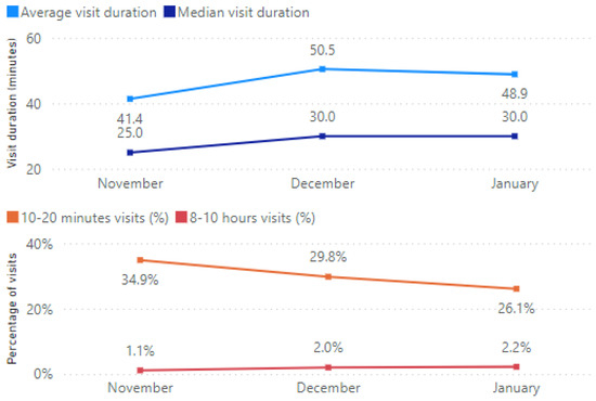 Data for the three consecutive months of November, December and January 2019 were collected to analyse the impact of the actions taken by PBL Care. Figure 10 presents the average visit duration, median visit duration, percentage of visits between 10 and 20 min, and percentage of visits between 8 and 10 h.