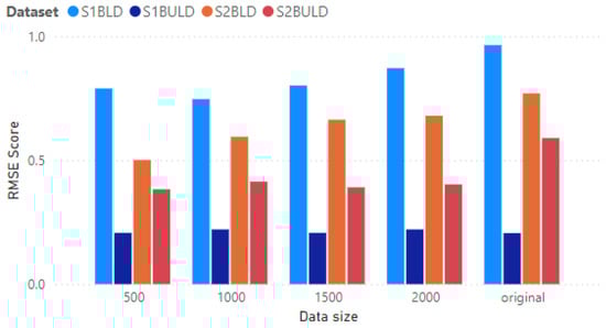 To build the product defect predictive model, we have applied six regression algorithms (Applied Machine Learning Algorithms section) to the oversampled data of up to 2000 instances. Table 4 and Table 5 summarise the Root Mean Square Error (RMSE) results of the models built with these algorithms and the best oversampling rates, 500 and 1000. The RMSE is a regression performance measure used to evaluate the differences between actual and model predicted parameter values. It is computed as per Equation (5), where n , y i , y ^ i represent the sample size, and actual and predicted values, respectively.