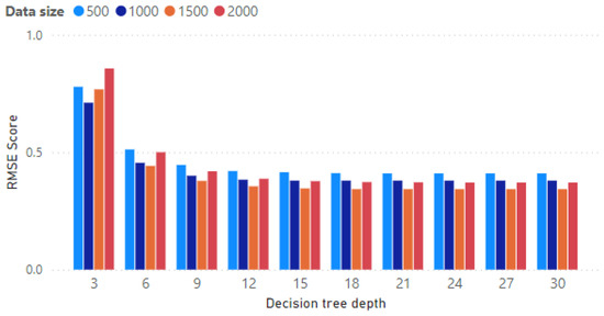 To investigate any possible further improvement that might be achieved with the best identified model, we have tuned the decision tree depth hyperparameter. For illustration purposes only, Table 7 and Figure 14 show the model errors (hence accuracy) for the S1BLD target variable for different oversampled training data sizes while varying decision tree depths. The results show that model accuracy improves with increasing decision tree depth, although the errors become stable from a maximum depth of 21. In addition, the oversampled data of size 1500 instances consistently achieves the lowest error with various models.