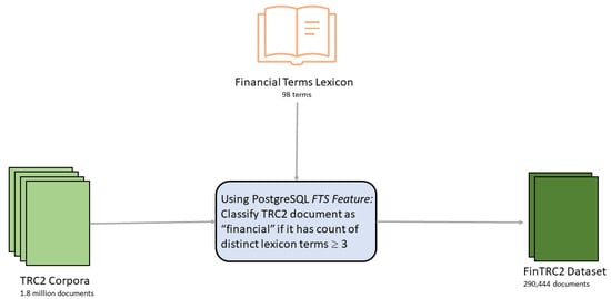 A similar classification of documents in the TRC2 dataset by Araci [] generated 46,143 financial documents; however, in that work, no details of the classification process were provided other than that it was keyword-based. In this work, we created a custom dictionary with 98 financial terms. As shown in Figure 1, each document in the TRC2 corpus was preprocessed as follows: first, the document was parsed to identify the lexeme type of each token, such as, for example, digits, words, complex words, and email addresses, then linguistics rules were applied to normalize the lexemes to their infinitive form; finally, the preprocessed document was stored as a sorted array of lexemes []. Each term in the custom dictionary was parsed to a lexeme. We searched the preprocessed document lexemes for each dictionary lexeme. If a preprocessed document had at least 3 dictionary lexemes, we classified the corresponding TRC2 document as a financial document. We used the full-text search (FTS) feature in PostgreSQL to preprocess each document in the TRC2 corpus and stored it as a tsvector. We then performed the search of the dictionary lexemes on the tsvectors using tsquery and the other FTS operators.