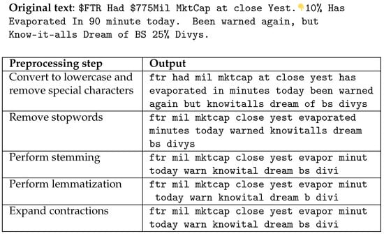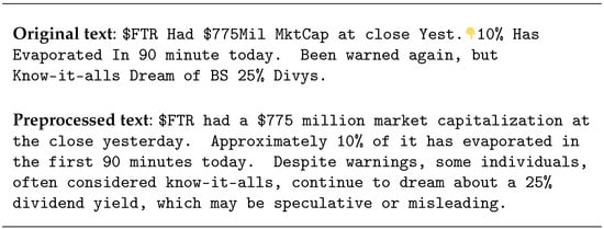 The datasets used for fine-tuning remained in their raw state including misspelled words, emojis, emoticons, jargon, numbers, and connotations. The decision was made to use the power of embeddings to create the relationships of the tokens within the given document. As we explored preprocessing the text, we noticed that the original understanding of the document was lost and was nearly illegible. Preprocessing complex text like social media jargon or domain-specific information in finance may result in losing its meaning and understanding. An example of this is shown in Figure 3.