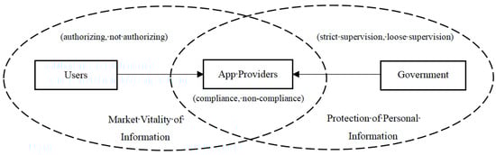 The main participants in the personal information authorization, flow and management of Apps are users, App providers and the government. Users are information sources communicating with providers that render Apps in a bid to access relevant features and services. Personalized and basic services are supplied to users by App providers, who also act as information recipients and value converters. Robust government regulation is necessary because App providers often take advantage of opportunities to engage in non-compliant actions, crossing lines and harvesting user data excessively, when they come across data segments with significant derivable value. The most valuable kind of data right now is user information, and users’ active participation will hasten the conversion of information value. This will have a significant impact on increasing business revenue and facilitating social and economic advancement. Furthermore, the strategic choices of all three parties are bounded rationality, which is affected by informational asymmetry, decision-making ability limitations, and exogenous variables. Each, in the relentless pursuit of optimizing their individual benefits, inevitably encounters conflicts with other participants involved. As such, the strategies they adopt are invariably shaped and reshaped by the actions and reactions of these counterparts. It follows, therefore, that the decision-making process among these tripartite entities does not result in an instant resolution but, rather, evolves through a series of iterations, gradually progressing towards a state of equilibrium, where the dynamics of their interaction reach a degree of stability. The aforementioned study indicates that the evolutionary game’s research base is consistent with the three parties’ strategic interaction in the context of App personal information authorization. The three parties’ relationship is shown in Figure 1.