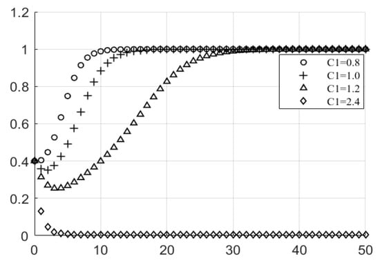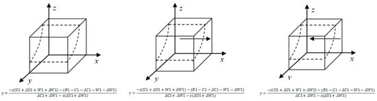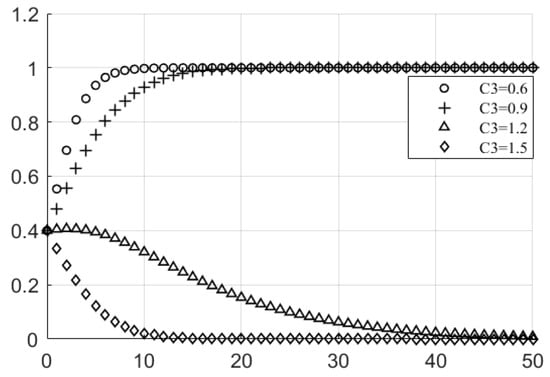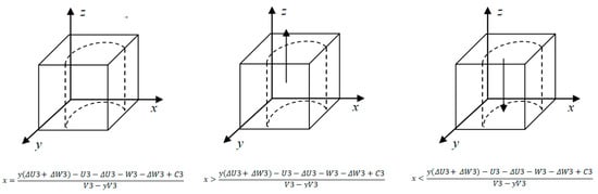 The integration of replication dynamic Equations (4), (8), and (12) forms a tridimensional system, within which, when U1(x), U2(y), and U3(z) are all zero, the equilibrium points of the system are identified as E1(0,0,0), E2(0,0,1), E3(0,1,0), E4(0,1,1), E5(1,0,0), E6(1,0,1), E7(1,1,0), E8(1,1,1), and E9(x*,y*,z*). Here , , . If an equilibrium point is asymptotically stable, it must be a pure strategy Nash equilibrium solution. Therefore, excluding the mixed Nash equilibrium solution E9(x*,y*,z*), it becomes necessary to conduct stability analysis on only eight equilibrium points: E1(0,0,0), E2(0,0,1), E3(0,1,0), E4(0,1,1), E5(1,0,0), E6(1,0,1), E7(1,1,0), and E8(1,1,1) []. As per the discriminant method proposed by Friedman in 1991 [], if all eigenvalues of the Jacobian matrix are less than zero, then this equilibrium point is considered an asymptotically stable point for the evolution of the system. The Jacobian matrix of the tripartite game subject is