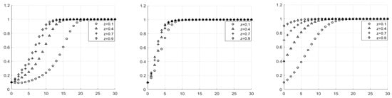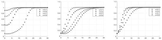 Based on the initial conditions that converge to the equilibrium point E8(1,1,1) as defined by Equations (1)–(3): C1 < R1 + U1, ΔR2 < W2 + ΔC2 + C2, and C3 < U3 + W3. We examined the impact of users’ initial strategy changes on the outcomes of the tripartite evolution. For this analysis, we assigned the following initial values in Table 4. The initial strategies were established with x = 0.1, y = 0.1 and z = 0.1. When x assumes values of 0.1, 0.4, 0.7, and 0.9 in succession, the influence of these trends on users’ strategic choices, App providers’ decisions, and government policies is illustrated in Figure 5. As shown in the figure, when users are more likely to choose the “authorization” strategy, they evolve faster toward this strategy. On the other hand, it slows down the evolution of App providers towards a “compliance” strategy and speeds up the evolution of government towards a “strict supervision” strategy. The rationale is that when users provide their personal information, it gives App providers an opportunity to obtain additional information gains, so they are reluctant to adopt compliant privacy practices. For the government, facing the situation of user authorization, the loss of credibility and potential losses caused by non-regulation become important factors, so strict supervision becomes its main choice.