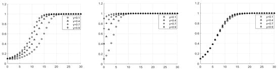 To investigate the influence of a shift in initial strategies on the tri-evolutionary outcomes of App providers, we initially establish the baseline values for each parameter as presented in Table 5. Herein, the initial strategies are designated with x = 0.4 and z = 0.4. The trend effects on the strategic decisions of users, App providers, and governments are depicted in Figure 6, where y assumes values of 0.1, 0.4, 0.7, and 0.9 in sequence. As illustrated by the graph, the greater the probability that App providers choose the “compliance” strategy, the faster users evolve toward the “authorization” strategy. Similarly, the providers themselves also evolve more rapidly toward the “compliance” strategy. While the government’s evolution is less pronounced, it is still discernible that the speed at which it moves toward “strict supervision” increases. The probable reason for these dynamics is that the App providers’ choice to adopt compliant privacy practices reinforces users’ determination to authorize personal information. Moreover, the government’s strategy selection is more significantly influenced by users’ strategy choices than by those of the providers. As such, the user authorization behavior spurred by the App providers’ compliant information collection becomes the primary factor driving the government’s quicker adoption of strict supervision.