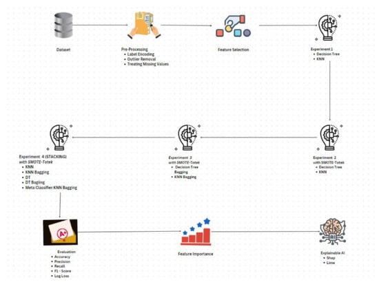Additionally, we combined KNN, DT, KNN bagging, and DT bagging models with KNN bagging as the meta-classifier into a single, robust model. We used the permutation feature importance tool to identify the most important features contributing to model accuracy and XAI for deeper explanations and a better understanding of the underlying features. Using the SHAP and LIME techniques with the stacking model, we found the most relevant features that contributed to the model’s prediction.