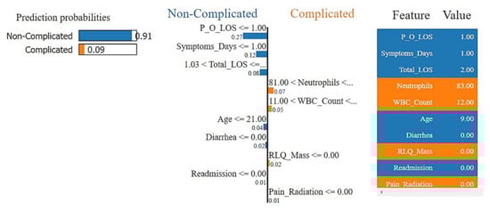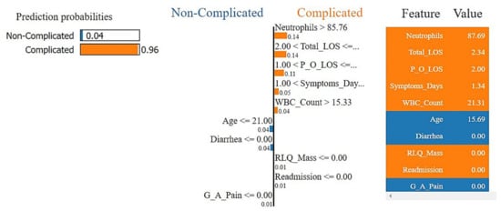 61]. Nevertheless, explainable AI implemented in this study showed neutrophils and WBC_Count to be important markers in diagnosing complicated appendicitis. Neutrophil and WBC_Count values above 85.76 and 15.33, respectively, are likely to be complicated. Furthermore, people below 21 years of age are more prone to non-complicated appendicitis than complicated ones.